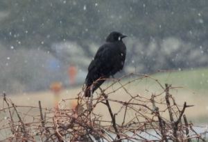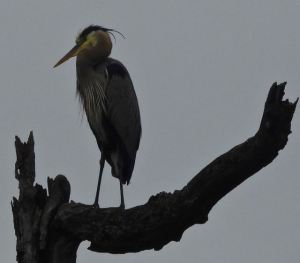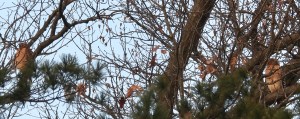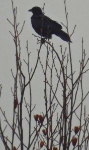 Talk about woodpeckers: here’s a large pileated one in the woods next to our garden plot, cloudy November 25