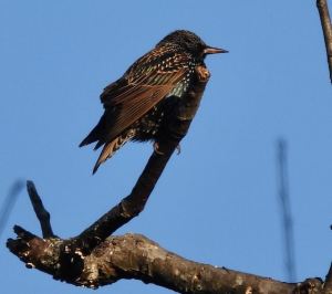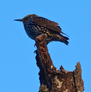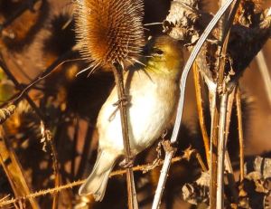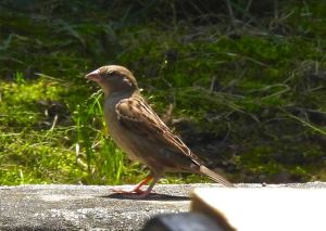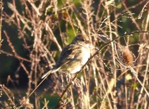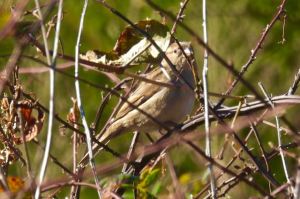 One of our ubiquitous House Sparrows chatters with us and friends along the north shore, November 21