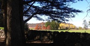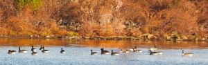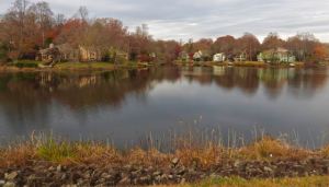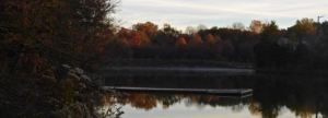 Late fall colors: Looking southwest on the lake with Geese and fountain, morning, November 3