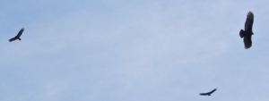 Two Rock Doves, the usual inhabitants of the top of the power tower, claim their space–and keep their distance–from the visiting Bald Eagle, crisp morning, November 3