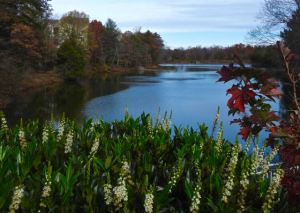 Chris: Surprises always happen as we walk around our little lake, but several were especially memorable this month. The Bald Eagle I saw on the power tower west of the lake on Nov. 6 was a first for me here, as was the Yellow-Bellied Sapsucker pictured just below. On the 20th, I got one of my biggest surprises in the 3 years we’ve lived here, when I turned from watching the lake’s northeast shore and was startled by a young White-Tail Deer watching me–from no more than 10 feet away! Remarkably patient and inquisitive, this new friend moved slowly away, but kept eyes on me while munching on leaves and “hiding” visibly in the saplings and reeds. Three videos captured the conversation, two of which I show here. Though deer are always present in the nearby woods, I only see one every few months or so, and never before so close. How thankful I am for these moments when I can mutually treasure our green space with one or more of these neighbors.