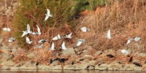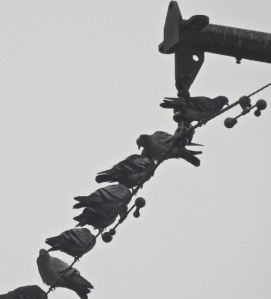 60 Rock Doves in their accustomed perch atop the power tower, November 21. No Bald Eagles around!