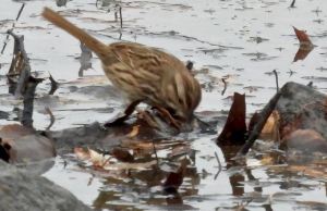 Song Sparrow feeds along the gravel path on the hillside below the dam, as cars sound from the highway, November 21